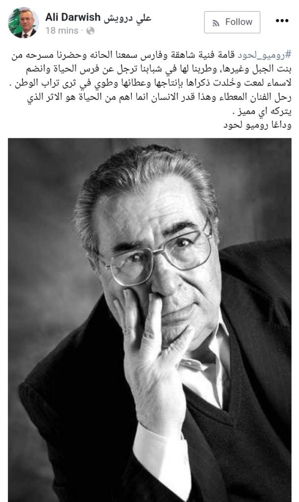 رثى النائب السابق علي الدرويش المسرحي الكبير روميو لحود مؤكدا انه قامة فنية شاهقة وفارس سمعنا الحانه وحضرنا مسرحه من بنت الجبل وغيرها، وطربنا لها في شبابنا ترجل عن فرس الحياة وانضم لاسماء لمعت وخُلدت ذكراها بإنتاجها وعطائها وطوي في ثرى تراب الوطن .