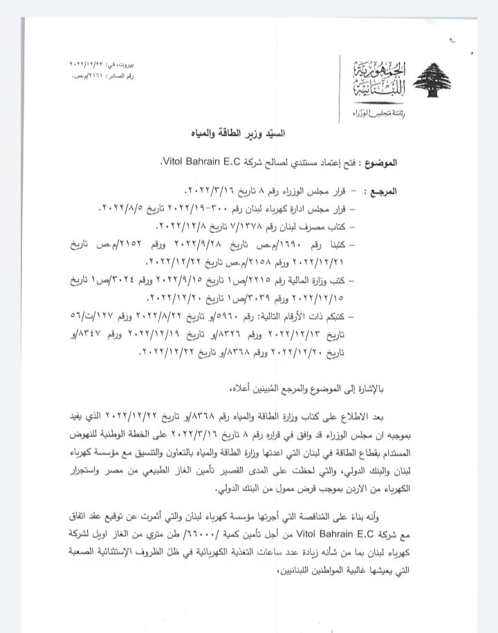 وكانت قد– غردت عضو تكتل “لبنان القوي” النائبة ندى بستاني عبر حسابها على “تويتر”: “بالوثيقة: الرئيس ميقاتي بيعطي موافقة استثنائية لفتح اعتماد بواخر الفيول. بغض النظر عن دستورية الموافقة الاستثنائية، كيف بـ٢٣ كانون الأول ما كان في لزوم لمجلس وزراء وما كان في مشكلة بفتح الاعتمادات واليوم فجأة صار في لزوم وصار في مشكلة؟؟!!
