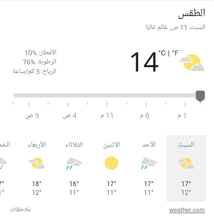 السبت: غائم جزئياً مع ضباب على المرتفعات وانخفاض اضافي طفيف بدرجات الحرارة في المناطق الجبلية والداخلية بينما تستقر على الساحل، تتساقط الأمطار الخفيفة بشكل متفرق أحياناً خاصة في المناطق الشمالية والجنوبية خلال النهار مع بعض الثلوج على ارتفاع ١٧٠٠ متر وما فوق، يستقر الطقس مساءً ويتحول الى قليل الغيوم مع التحذير من تشكل الجليد على الطرقات الجبلية التي تعلو عن ال ٢٢٠٠ متر.