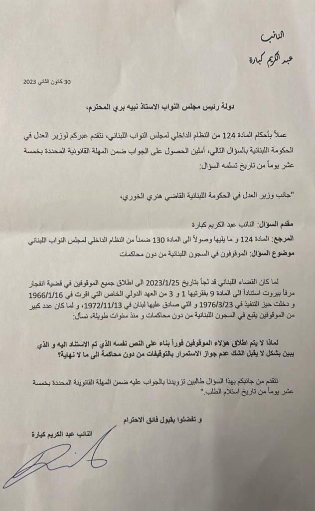 وجاء في نص السؤال الذي وجهه كبارة: “لما كان القضاء اللبناني قد لجأ بتاريخ 25/1/2023 الى اطلاق جميع الموقوفين في قضية انفجار مرفأ بيروت استناداً الى المادة 9 بفقرتيها 1 و3 من العهد الدولي الخاص التي أقرت في 16/1/1966 ودخلت حيز التنفيذ في 23/3/1976 والتي صادق عليها لبنان في 3/11/1972، ولما كان عدد كبير من الموقوفين يقبع في السجون اللبنانية من دون محاكمات ومنذ سنوات طويلة، نسأل: لماذا لا يتم اطلاق هؤلاء الموقوفين فوراً بناء على النص نفسه الذي تم الإستناد اليه والذي يبيّن بشكل لا يقبل الشك عدم جواز الإستمرار بالتوقيفات من دون محاكمة الى ما لا نهاية؟