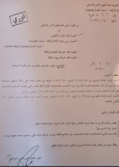 وجه المدير العام لقوى الأمن الداخلي اللواء عماد عثمان، الى هيئة الأركان – شعبة الخدمة والعمليات كتاباً حول توقيف الصرافين والمضاربين على العملة الوطنية.