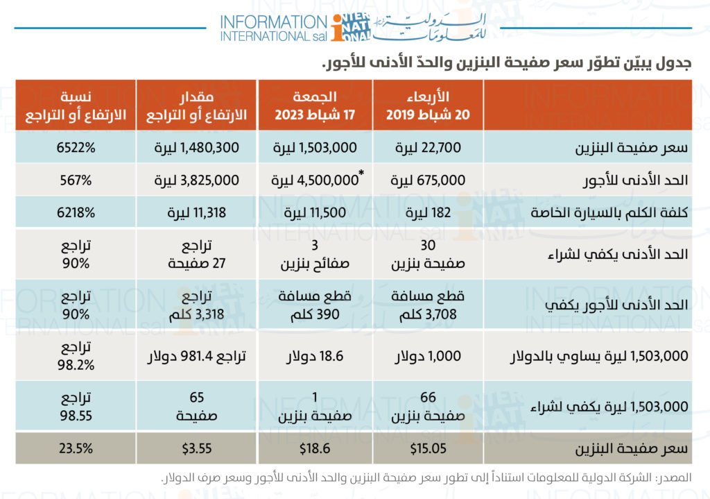 نشرت “الدولية للمعلومات” تقريراً تحت عنوان: “(1,000 دولار) ثمن صفيحة البنزين! ارتفاع السعر بين شهري شباط 2019 و2023”.