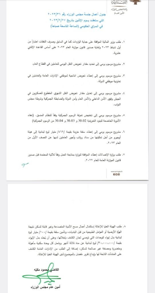 وطنية – يعقد مجلس الوزراء بهيئة تصريف الأعمال، جلسة عند الساعة التاسعة من صباح يوم الإثنين الواقع فيه 27/2/2023 في السرايا الحكومية، وعلى جدول اعمالها 8 بنود.