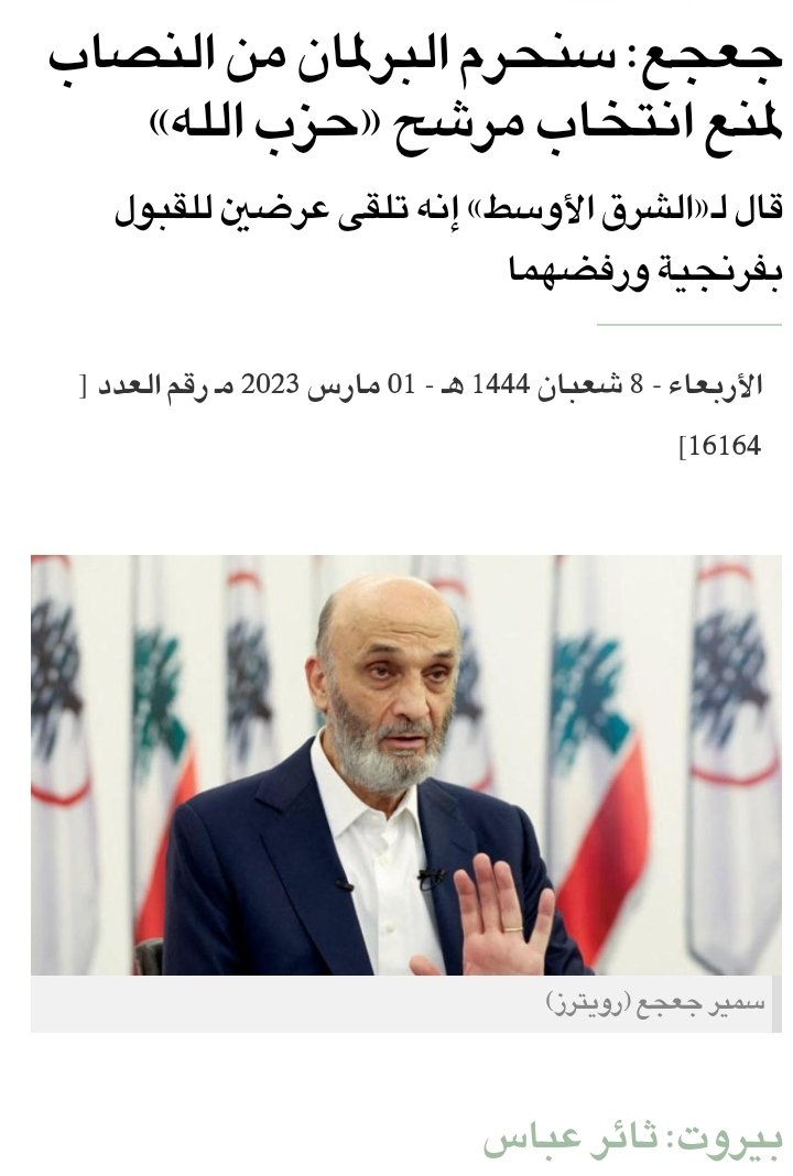 وقال جعجع في حديث لـ “الشرق الأوسط”: “حزب الله مصرّ على مرشحه، أما نحن كمعارضة فلسنا على استعداد تحت ضغط الأزمة، للذهاب إلى حل يعمق الأزمة. ما نسعى له هو حل الأزمة وليس تعميقها”. ويضيف “للأسف، لا مخارج في المدى المنظور. نحن في أزمة كبيرة، يجب أن نقوم بما علينا للخروج منها. بالتالي، لا يمكن أن نأتي بأي رئيس جمهورية لأنه لن يخرجنا من الأزمة، بل سيعمّقها. حزب الله مصرّ على فرنجية. وإذا بدّل عن فرنجية، فسيذهب إلى شبيه له. وإذا بدل وجهة نظره عن الشبيه، سيذهب إلى خيار مرشح عاجز عن التغيير. بالتالي، الأزمة الحقيقية أن الحزب لا يريد رئيساً فعلياً للبنان”.