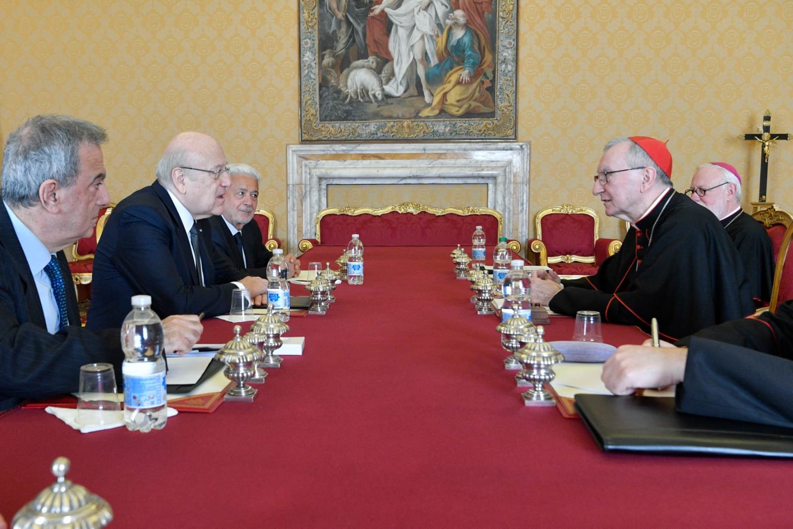 أجرى رئيس الحكومة نجيب ميقاتي، عقب اجتماعه مع قداسة البابا فرنسيس، محادثات مع أمين سرّ حاضرة الفاتيكان الكاردينال بييترو بارولين، ووزير خارجية الفاتيكان الكاردينال بول غلاغير،في حضور السفير اللبناني لدى الفاتيكان فريد الخازن، والمستشار الديبلوماسي للرئيس ميقاتي السفير بطرس عساكر.