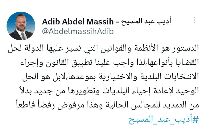 غرد النائب أديب عبد المسيح كاتبا : الدستور هو الأنظمة والقوانين التي تسير عليها الدولة لحل القضايا بأنواعها،لذا واجب علينا تطبيق القانون وإجراء الانتخابات البلدية والاختيارية بموعدها،لابل هو الحل الوحيد لإعادة إحياء البلديات وتطويرها من جديد بدلاً من التمديد للمجالس الحالية وهذا مرفوض رفضاً قاطعاً #أديبعبدالمسيح
