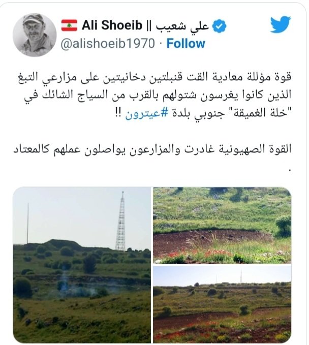 غرد الإعلامي علي شعيب عبر “تويتر”، مشيرا الى أن قوة مؤللة إسرائيلية القت قنبلتين دخانيتين على مزارعي التبغ الذين كانوا يغرسون شتولهم بالقرب من السياج الشائك في خلة الغميقة، جنوبي بلدة عيترون.