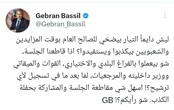 وكتب:”ليش دايماً التيار بيضحّي للصالح العام بوقت المزايدين والشعبويين بيكذبوا ويستفيدوا؟ اذا قاطعنا الجلسة، شو بيعملوا بالفراغ البلدي والاختياري، القوات والميقاتي ووزير داخليته والمرجعيات، لمّا بعد ما في تسجيل لأي ترشيح؟! اسهل شي مقاطعة الجلسة والمشاركة بحفلة الكذب. شو رأيكم؟”.