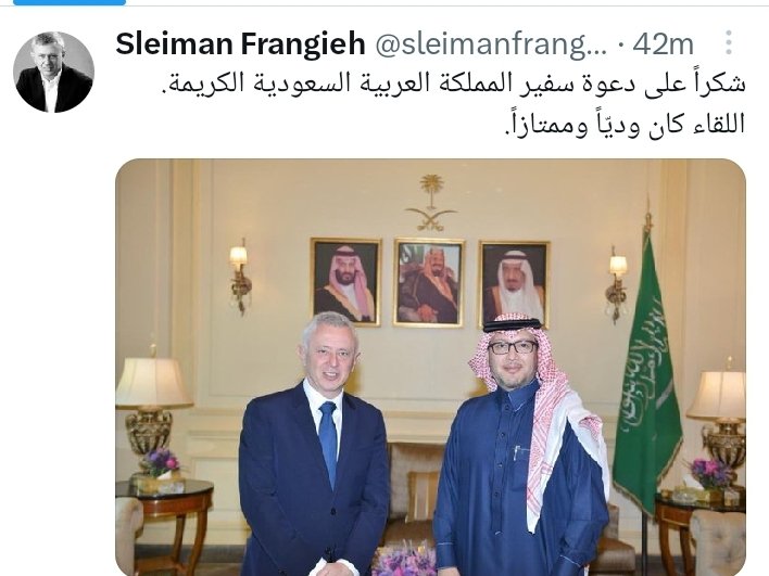 غرد رئيس تيار المردة سليمان فرنجية كاتبا : شكراً على دعوة سفير المملكة العربية السعودية الكريمة. اللقاء كان وديّاً وممتازاً