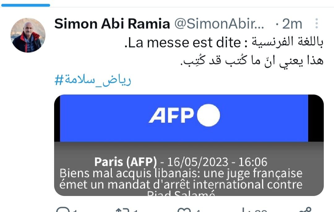 تعليقا على صدور مذكرة توقيف دولية بحق حاكم مصرف لبنان رياض سلامة كتب النائب سيمون ابي رميا عبر تويتر: