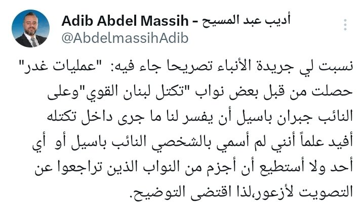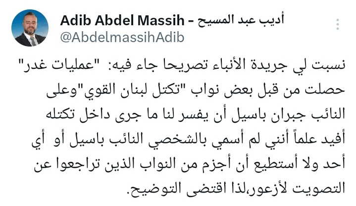 أفيد علماً أنني لم أسمي بالشخصي النائب باسيل أو أي أحد ولا أستطيع أن أجزم من النواب الذين تراجعوا عن التصويت لأزعور،لذا اقتضى التوضيح.