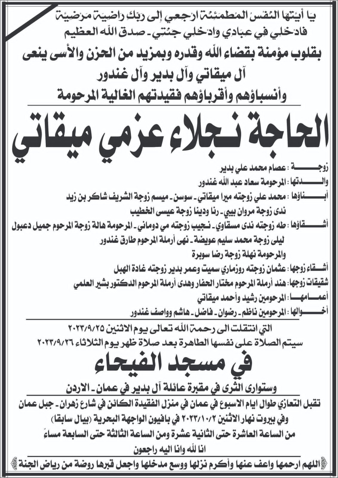 غيب الموت مساء اليوم السيدة نجلاء ميقاتي بدير شقيقة رئيس الحكومة نجيب ميقاتي.