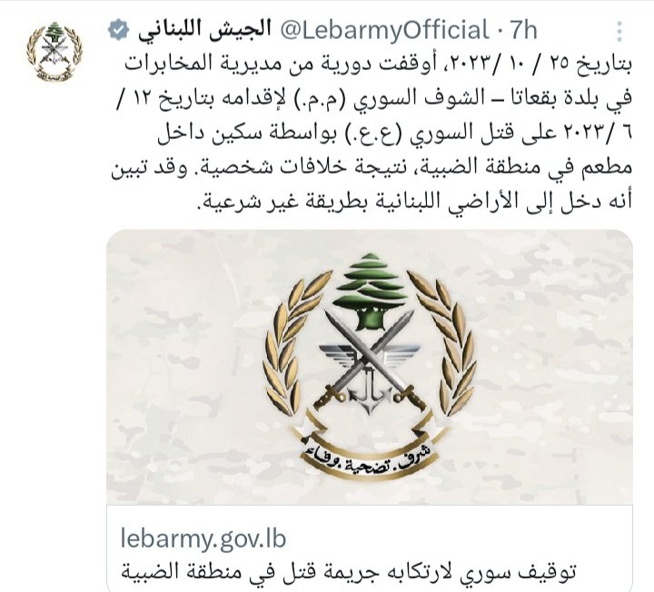 أوقفت دورية من مديرية المخابرات في بلدة بقعاتا – الشوف السوري (م.م.) لإقدامه بتاريخ 12 / 6 /2023 على قتل السوري (ع.ع.) بواسطة سكين داخل مطعم في منطقة الضبية، نتيجة خلافات شخصية. وقد تبين أنه دخل إلى الأراضي اللبنانية بطريقة غير شرعية.